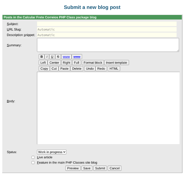 Once you are there click on the Post Article link. The click on the Submit a new blog post link. In that page you can see an editor that lets you edit the article subject, summary and body text.